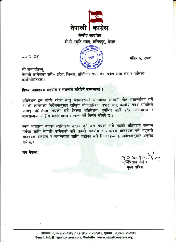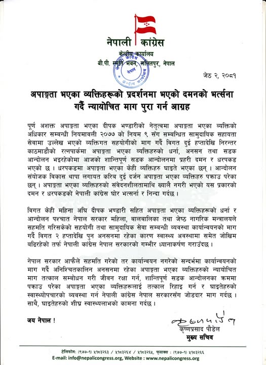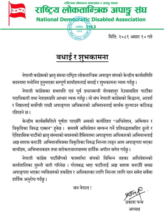 नेपाली कांग्रेसको परिपत्रः रा.लो. अपाङ्ग संघको अधिवेशन सम्पन्न गर्न आवश्यक सहयोग र समन्वय गरिदिने