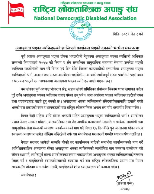 अपाङ्गता भएका व्यक्तिहरूको प्रदर्शनमा भएको दमनको भत्र्सना गर्दै न्यायोचित माग पुरा गर्न आग्रह