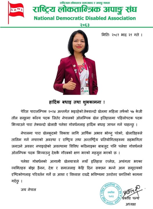हार्दिक बधाइ तथा शुभकामनाः पेरिस पारालम्पिक २०२४ को काँस्य पदक विजेता पारा तेक्वन्दो खेलाडी पलेशा गोवर्धन