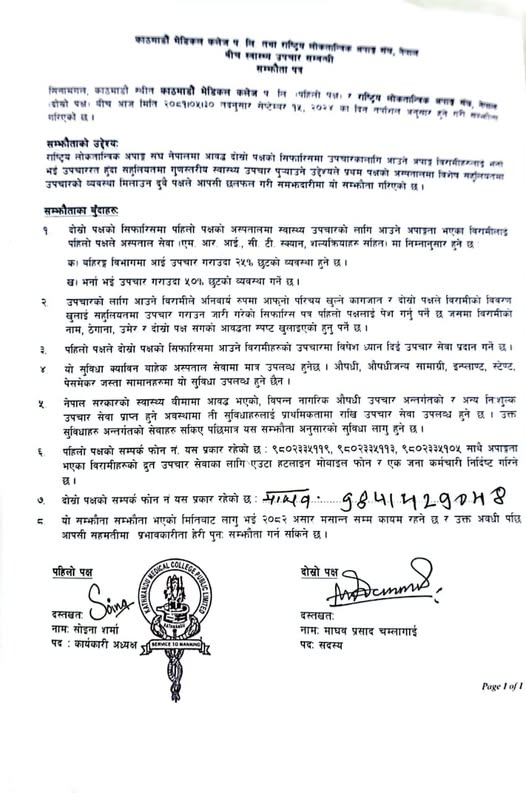 अपांगता भएका व्यक्तिको स्वस्थ्य उपचार सम्बन्धि सम्झौता