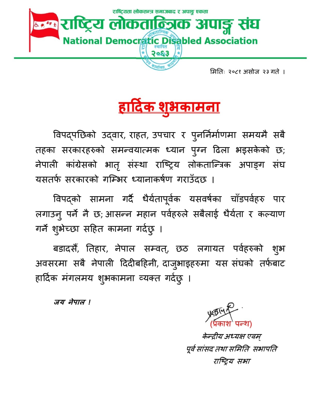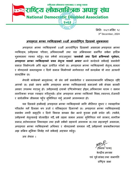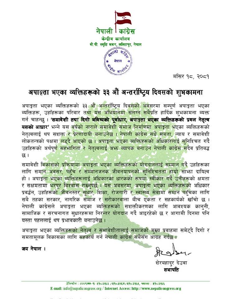 नेपाली कांग्रेसका सभापतिज्यूले ३३ औं अन्तर्राष्ट्रिय अपाङ्गता दिवसको अवसरमा दिनुभएको शुभकामना