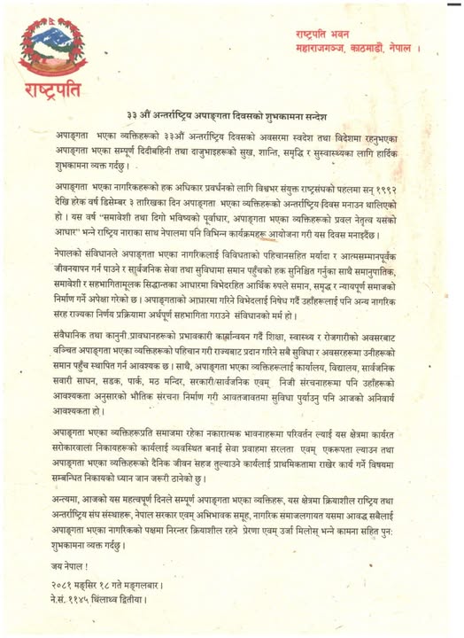 सम्माननीय राष्ट्रपति श्री रामचन्द्र पौडेलज्यूले ३३ औं अन्तर्राष्ट्रिय अपाङ्गता दिवसको अवसरमा दिनुभएको शुभकामना सन्देश
